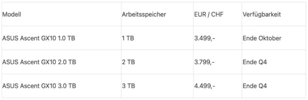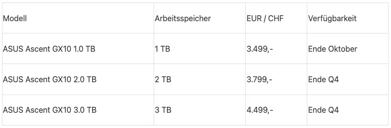 Der ASUS Ascent GX10 ist in Deutschland, Österreich und Schweiz zu folgenden unverbindlichen Preisempfehlungen inkl. MwSt. zunächst bei unserem Launch-Partner primeLine Solutions GmbH verfügbar: