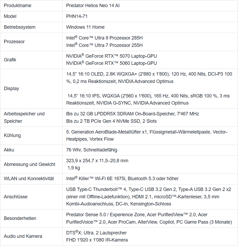 Das brandneue Predator Helios Neo 14 AI (PHN14-71) Gaming-Notebook erweitert Acers beliebte Helios Neo-Reihe. Es unterstützt bis zu einem Intel® Core™ Ultra 9 Prozessor 285H und bis zu einer NVIDIA® GeForce RTX™ 5070 Laptop GPU mit DLSS 4. Es bietet bis zu 32 GB schnellen LPDDR5X 6.400 MHz Onboard-Speicher, während bis zu 2 TB PCIe Gen4 SSDs Speicherplatz bereitgestellt wird. Das Predator Helios Neo 14 AI ist mit einem 14,5-Zoll OLED-Display im 16:10 Format mit 2,8K WQXGA+ (2.880 x 1.800) ausgestattet, das eine Reaktionszeit von 0,2 ms aufweist und 100 Prozent der DCI-P3-Farbspezifikation unterstützt, so dass sowohl Spiele als auch die Arbeit mit hoher Farbgenauigkeit dargestellt werden können. Es bietet ausserdem Unterstützung für NVIDIA® Advanced Optimus. Die Kühlung all dieser Leistung in einem so schlanken Gehäuse ist dank Acers 5th Gen AeroBlade Technologie, Flüssigmetall-Wärmeleitpaste auf der CPU, einer Vector Heatpipe und Acers Vortex Flow System ein Kinderspiel.