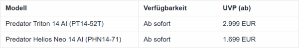 - Predator Helios Neo 14 AI: bis zu Intel Core Ultra 9 Prozessor 285H, bis zu einer NVIDIA GeForce RTX 5070 Laptop GPU und ein 2.8K OLED-Display mit 0,2 ms Reaktionszeit.