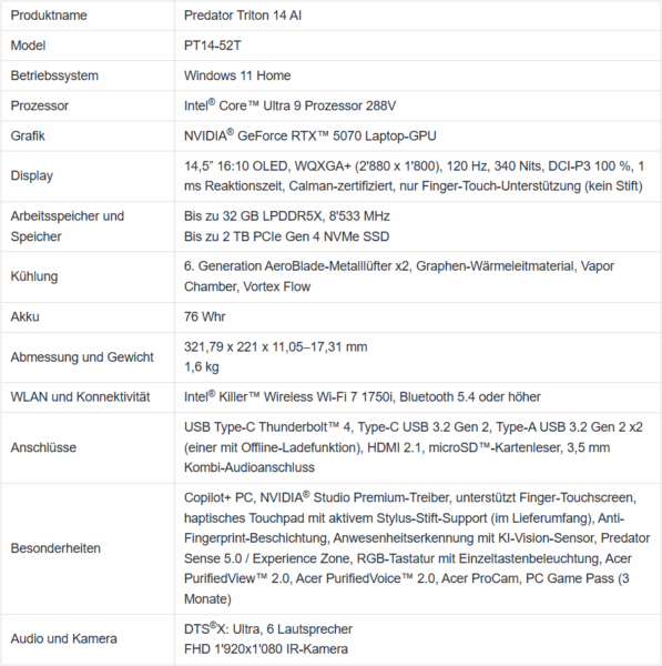 - Predator Triton 14 AI: Intel Core Ultra 9 Prozessor 288V und eine NVIDIA GeForce RTX 5070 Laptop GPU und haptisches Trackpad.