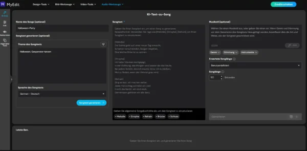 Im Browserinterface von MyEdit geben User zunächst ihren Text ein, beispielsweise einen Vers oder Refrain und legen Parameter wie Musikstil (z.B. Pop, Ballade, Hip-Hop oder Elektronik), Stimmung (fröhlich, melancholisch, dramatisch) und Instrumentierung (Gitarren, Klavier, Synthesizer etc.) fest. Anschließend analysiert die KI die Wortwahl, den Rhythmus und das Metrum und erstellt die passende Melodie zum Text. Dazu erstellt das Online-Tool ein Arrangement mit passenden Akkorden, Harmonien und Begleitinstrumenten. Innerhalb kürzester Zeit entsteht so ein fertiger Song. Alternativ kann das Thema eines Liedes auch als Prompt eingegeben werden, um einen Songtext mit KI zu genieren.