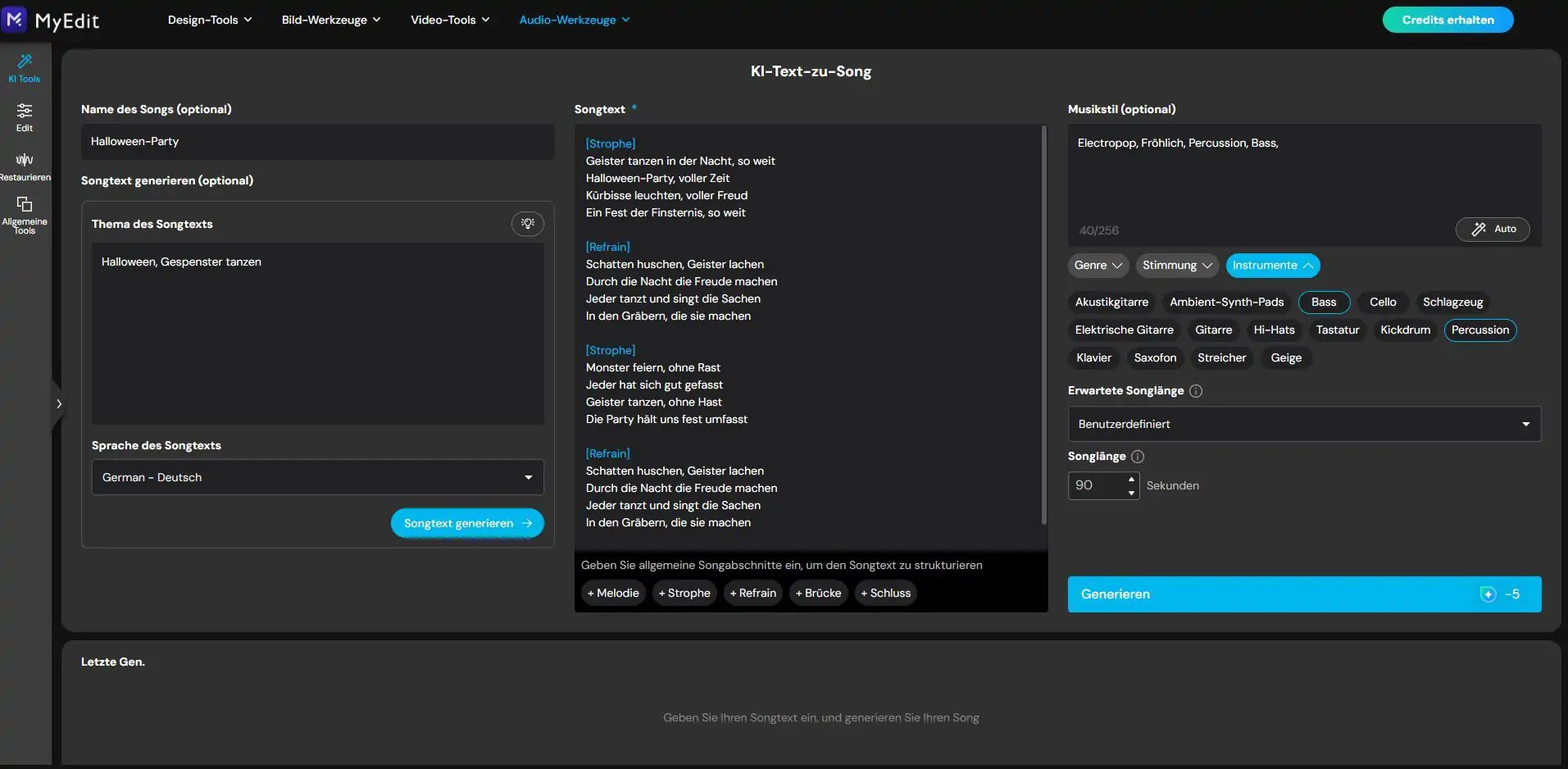 Im Browserinterface von MyEdit geben User zunächst ihren Text ein, beispielsweise einen Vers oder Refrain und legen Parameter wie Musikstil (z.B. Pop, Ballade, Hip-Hop oder Elektronik), Stimmung (fröhlich, melancholisch, dramatisch) und Instrumentierung (Gitarren, Klavier, Synthesizer etc.) fest. Anschließend analysiert die KI die Wortwahl, den Rhythmus und das Metrum und erstellt die passende Melodie zum Text. Dazu erstellt das Online-Tool ein Arrangement mit passenden Akkorden, Harmonien und Begleitinstrumenten. Innerhalb kürzester Zeit entsteht so ein fertiger Song. Alternativ kann das Thema eines Liedes auch als Prompt eingegeben werden, um einen Songtext mit KI zu genieren.