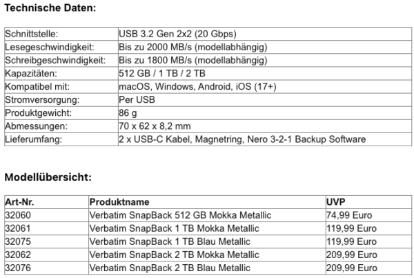 Die Verbatim SnapBack SSD ist ab sofort über autorisierte Händler und Distributoren erhältlich.