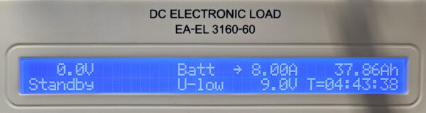 Das Entladen über Gleichspannung habe ich wie gewohnt über die 12 Volt Kfz-Buchse getestet. Dazu stelle ich an einer elektronischen Last einen Strom von acht Ampere ein. Die Last erfasst die gesamte entladene Kapazität in Amperestunden, welche wir mit der Spannung der Kfz-Steckdose multiplizieren und so auf die nutzbare Kapazität in Wattstunden kommen.