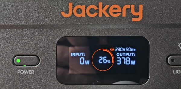 Die Umschaltzeit wird mit 10 ms angegeben. Ältere Kühlgeräte ohne Inverter-Kompressor können an dieser Powerstation also problematisch sein. Wir belasten die Powerstation mit genau 400 Watt bei einem Powerfaktor von 0.85, die Jackery zeigt hingegen nur 378 Watt Leistung an. Insgesamt konnte ich 430 Wh entnehmen, was einem Wirkungsgrad von nur 84 Prozent entspricht.
