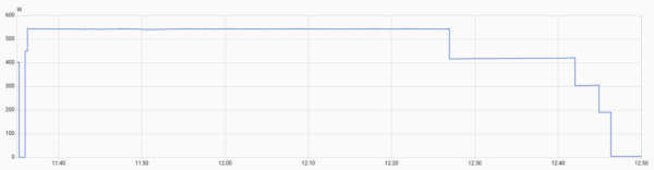 Erfasst haben wir eine Kapazität von knapp 38 Ah, bei einer Spannung von ca. 13.0 Volt ergibt dies eine nutzbare Kapazität von 492 Wattstunden. Dies entspricht einem Wirkungsgrad von 96 Prozent, bei einer angenommen Batteriekapazität von 512 Wh.