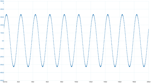 Der Inverter der Jackery macht leise Geräusche, wenn er aktiv ist. Im normalen Alltag sicher kein Problem, daneben schlafen würde ich aber nicht wollen. Die Wellenform des Sinus wird dadurch nicht beeinträchtigt. Für alle, die nicht so sehr in der Elektrotechnik stehen: die 230 Volt Nennspannung sind nur der Effektivwert in unserem Stromnetz, die Peakspannung liegt um die Wurzel von Zwei höher, also bei gut 320 Volt.