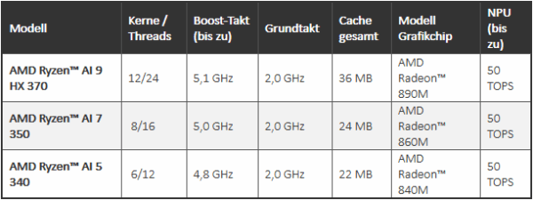 - AMD Ryzen™ AI 300 Prozessoren mit einer NPU-Beschleunigung von bis zu 50 TOPS.