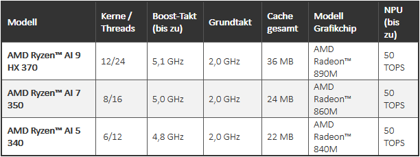 - AMD Ryzen™ AI 300 Prozessoren mit einer NPU-Beschleunigung von bis zu 50 TOPS.