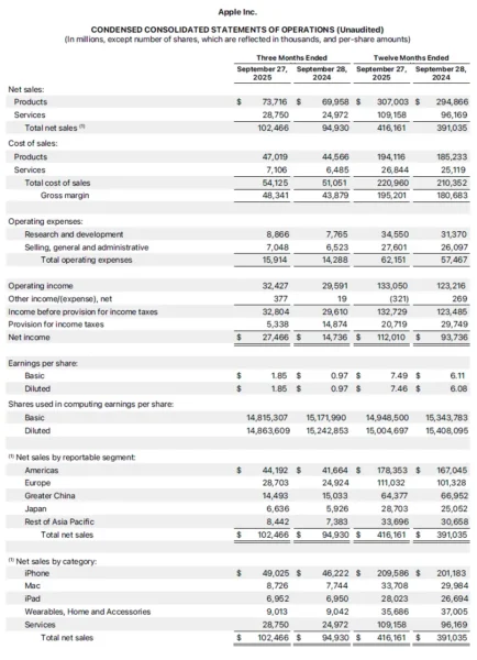 Apple today announced financial results for its fiscal 2025 fourth quarter ended September 27, 2025. The Company posted quarterly revenue of $102.5 billion, up 8 percent year over year. Diluted earnings per share was $1.85, up 13 percent year over year on an adjusted basis.1