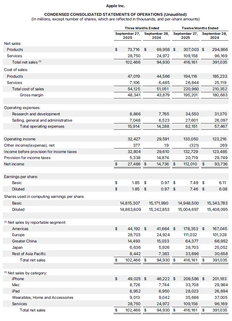 Apple today announced financial results for its fiscal 2025 fourth quarter ended September 27, 2025. The Company posted quarterly revenue of $102.5 billion, up 8 percent year over year. Diluted earnings per share was $1.85, up 13 percent year over year on an adjusted basis.1