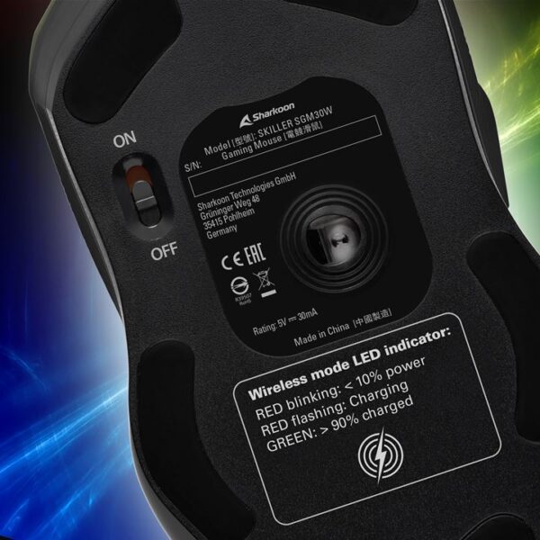 Das RGB-beleuchtete Logo auf der Oberseite der SKILLER SGM30W sorgt nicht nur für farbige Highlights, sondern dient zugleich als Anzeige für den Akkustand.