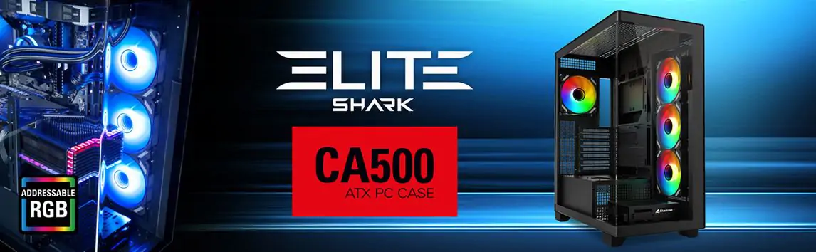 Mit seiner durchgängigen Glasfläche ist das ELITE SHARK CA500 von Sharkoon das ultimative Gehäuse für Hardware-Enthusiasten! Neben einem 270-Grad-Blick ins Innere bietet es dank Platz für bis zu zwei Radiatoren, seitlichem Lufteinzug und bereits vier vorinstallierten Lüftern aber auch eine beeindruckende Kühlleistung ab Werk. Moderne Anschlüsse und Kompatibilität zu den neusten BTF-Mainboards runden das ATX-Gehäuse dabei ab.