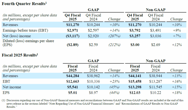 With the enactment of recent U.S. tax legislation in the One Big Beautiful Bill Act, we now expect our effective tax rate to generally remain in the 13% to 14% range and anticipate lower cash tax payments in future periods. However, this new tax legislation resulted in a non-cash $5.7 billion charge, or $5.29 per share, in the fourth quarter of fiscal 2025 to establish a valuation allowance against our U.S. federal deferred tax assets, as we now expect to be subject to the U.S. corporate alternative minimum tax beginning in fiscal 2026. This charge was excluded from our Non-GAAP metrics but impacted our GAAP results.