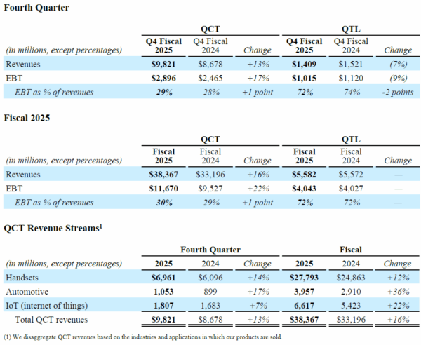 Qualcomm Incorporated (NASDAQ: QCOM) today announced results for its fiscal fourth quarter and year ended September 28, 2025. „Our business remains strong as demonstrated by record QCT revenues in fiscal 2025,” said Cristiano Amon, President and CEO of Qualcomm Incorporated. “We delivered 18% year-over-year growth in total QCT non-Apple revenues, with combined fiscal year Automotive and IoT revenue growth of 27%. We are excited about our business momentum, the availability of our automated driving stack, and our expansion to data centers and advanced robotics.”