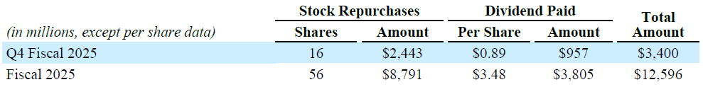 The following table summarizes our return of capital to stockholders, through stock repurchases and cash dividends, during the fourth quarter and fiscal 2025.