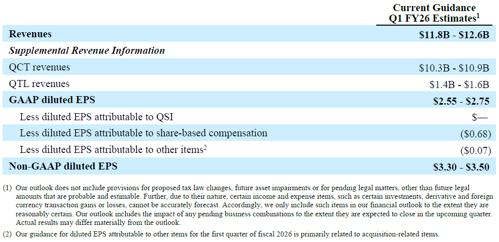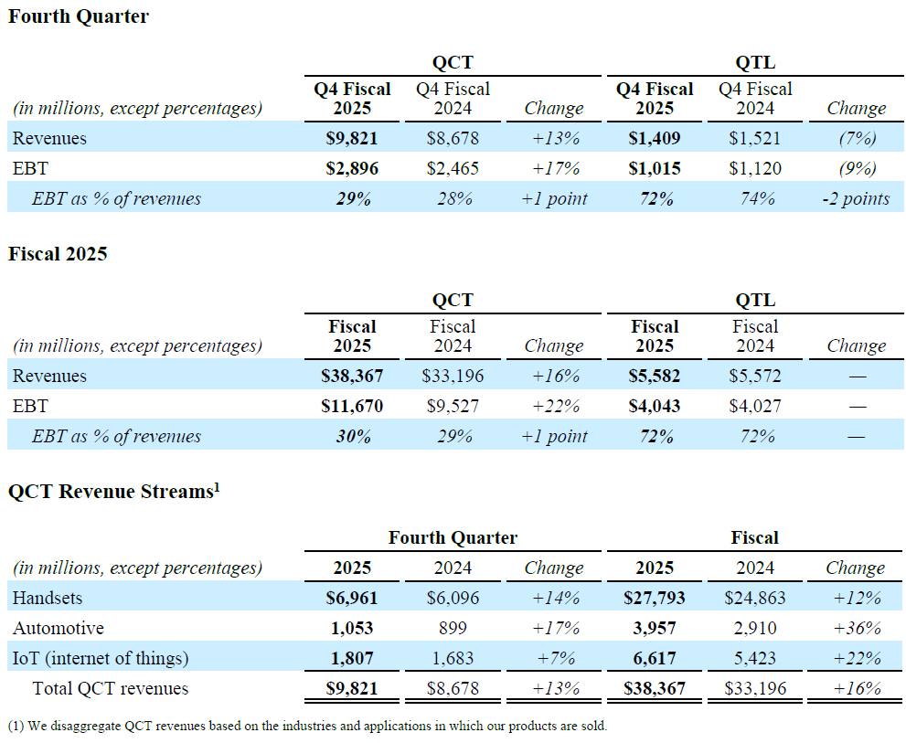 Qualcomm Incorporated (NASDAQ: QCOM) today announced results for its fiscal fourth quarter and year ended September 28, 2025. „Our business remains strong as demonstrated by record QCT revenues in fiscal 2025,” said Cristiano Amon, President and CEO of Qualcomm Incorporated. “We delivered 18% year-over-year growth in total QCT non-Apple revenues, with combined fiscal year Automotive and IoT revenue growth of 27%. We are excited about our business momentum, the availability of our automated driving stack, and our expansion to data centers and advanced robotics.”