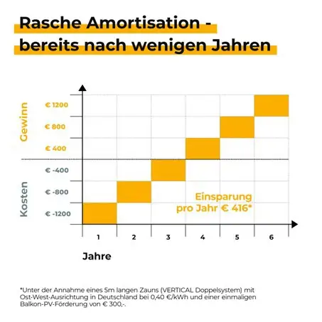 Weil man die Solarzäune bei einer maximalen Leistung von 800 Watt wie Balkonkraftwerke weder anmelden noch bewilligen lassen muss und sie in vielen Städten und Gemeinden zusätzlich gefördert werden, haben sie sich bereits nach zwei bis drei Jahren amortisiert. Ein Rechenbeispiel: Bei einer fünf Meter langen Zaunanlage mit Ost-West-Ausrichtung, einem Strompreis von 0,40 €/kWh und einer einmaligen Balkon-PV-Förderung von 300 Euro spart das System jedes Jahr 416 Euro Stromkosten ein. Somit haben sich die Anfangskosten in Höhe von 1.200 Euro bereits im vierten Betriebsjahr vollständig amortisiert.
