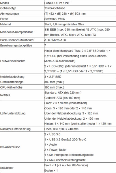 Das LANCOOL 217 INF ist ab dem 6. November 2025 erhältlich, zu einer UVP von 124,99 USD für die schwarze und 129,99 USD für die weiße Version.