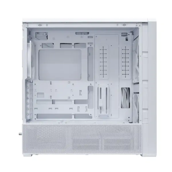 Das LANCOOL 217 INF kommt mit einem markanten Frontpanel aus gehärtetem Glas, das einen integrierten Infinity-Mirror bietet. Das Panel verfügt über zwei präzise geschnittene Airflow-Öffnungen für die vorinstallierten 170-mm-Lüfter, die einen direkten Lufteinlass ermöglichen, ohne die Kühlleistung zu beeinträchtigen. Beide Frontlüfter sind mit abnehmbaren Mesh-Abdeckungen aus Stahl geschützt, die für effektive Staubfilterung sorgen und eine einfache Reinigung ermöglichen.