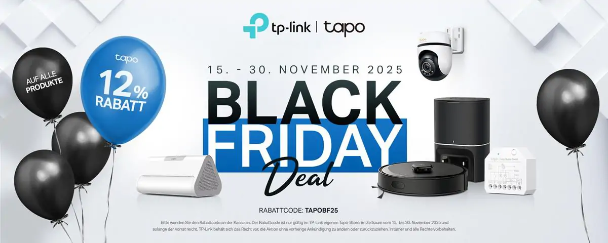Vom 15. bis 30. November 2025 läuft im Tapo Store die große Black-Week-Aktion. Während dieses Zeitraums erhalten Kunden mit dem Code TAPOBF25 12 % Rabatt auf das gesamte verfügbare Portfolio – von Sicherheitskameras über Thermostate bis hin zu Steckdosen, Sensoren und Beleuchtungslösungen. Die Rabattaktion ist der perfekte Zeitpunkt, um das eigene Zuhause zu einem smart Home aufzurüsten. Zu den interessantesten Produkten, die es im Rahmen der Black Week zu attraktiven Preisen geben wird, gehören zum Beispiel: