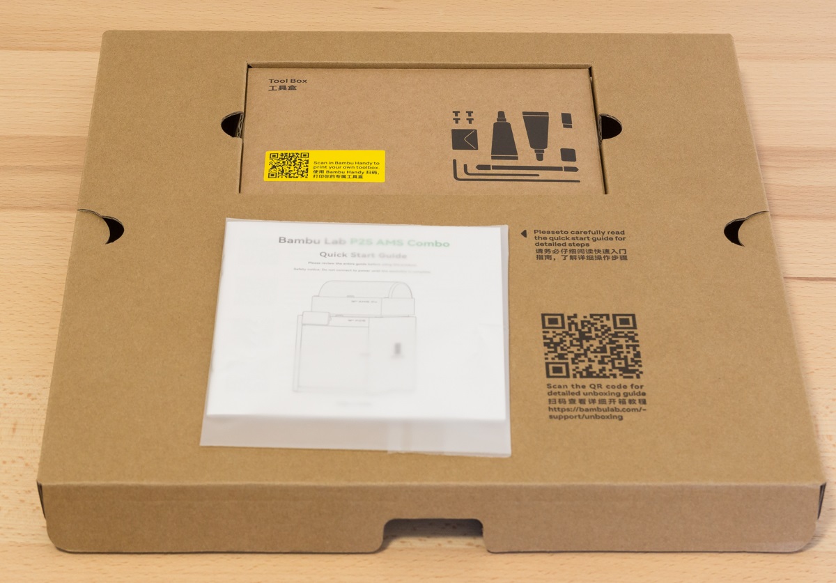 Ein Teil des Lieferumfangs befindet sich bei der Auslieferung direkt im Drucker. Das abgebildete Zubehör besteht aus etwas Werkzeug, Ersatzmaterialien und einer Schnellstartanleitung. Für eine Ersteinrichtung sollte aber der abgedruckte QR-Code gescannt werden, um auf die dort verlinkten Videos zu gelangen, die jeden Schritt sehr einfach erklären.