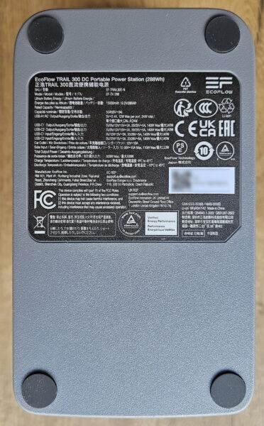 Die Trail 300 ist knapp 17x12x17 cm groß und wiegt gemessene 2598 Gramm. An der Front sind alle Anschlüsse untergebracht und der einzige Taster, der das Display und einen Low-Power-Modus über einen Doppelklick einschaltet. Im Low-Power-Modus bleiben die USB-A Ports für drei Stunden eingeschaltet, um kleine Geräte wie Kopfhörer zu laden. Ohne diesem Modus schaltet die Powerstation die USB-Ports ab – komplett ausschalten könnt ihr die Powerstation nicht.