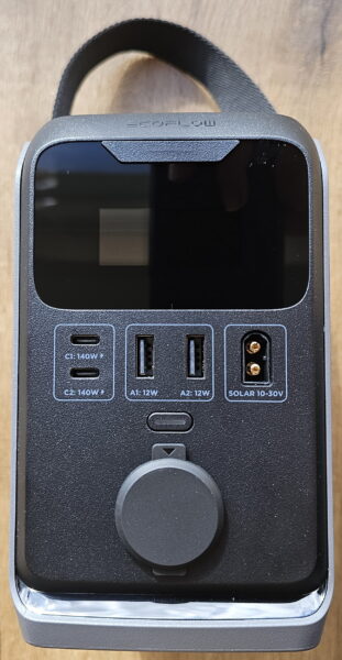 Wie schon erwähnt gibt es zwei USB-C Ports mit bis zu 140 Watt, welche auch zum Aufladen der Powerstation genutzt werden können und unabhängig voneinander ihre Leistung abgeben. Das Aufladen mit zwei Ladegeräten und bis zu 280 Watt ist hingegen manchmal etwas Glückssache, mehr dazu später im Praxisteil. Die beiden USB-A Ports liefern jeweils bis zu 12 Watt und die Kfz-Steckdose bis zu 120 Watt. In Summe können maximal 300 Watt aus der Powerstation entnommen werden. Der Solareingang wird auch für das Aufladen im Auto verwendet und ist im Bereich von 10-30 Volt funktionsfähig, maximal 110 Watt können eingespeist werden.