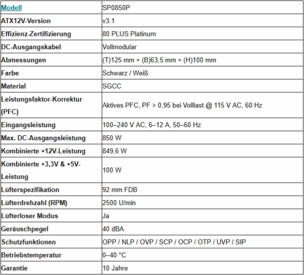 Die SP Platinum Serie ist 80 PLUS® Platinum-zertifiziert und erreicht bis zu 92 % Effizienz bei 50 % Last – mit präziser Spannungsregulierung und minimaler Restwelligkeit, selbst bei wechselnden Lastbedingungen. Sie ist vollständig kompatibel mit Intel ATX 3.1 und PCIe 5.1 und wird mit einem intern entwickelten 12V-2×6-GPU-Kabel ausgeliefert, das dank seiner Legierungskontakte für geringeren Widerstand, höhere Hitzebeständigkeit und einen zweifarbigen Stecker zur einfachen Sichtprüfung sorgt. Für eine lange Lebensdauer und stabile Leistung setzt die Serie auf 100 % japanische 105 °C-Kondensatoren und bietet umfassenden Schutz durch OCP, OVP, OTP, OPP, SCP, UVP, NLP und SIP – für maximale Zuverlässigkeit unter allen Bedingungen.