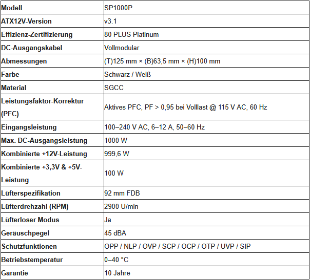 Die SP Platinum Serie ist 80 PLUS® Platinum-zertifiziert und erreicht bis zu 92 % Effizienz bei 50 % Last – mit präziser Spannungsregulierung und minimaler Restwelligkeit, selbst bei wechselnden Lastbedingungen. Sie ist vollständig kompatibel mit Intel ATX 3.1 und PCIe 5.1 und wird mit einem intern entwickelten 12V-2×6-GPU-Kabel ausgeliefert, das dank seiner Legierungskontakte für geringeren Widerstand, höhere Hitzebeständigkeit und einen zweifarbigen Stecker zur einfachen Sichtprüfung sorgt. Für eine lange Lebensdauer und stabile Leistung setzt die Serie auf 100 % japanische 105 °C-Kondensatoren und bietet umfassenden Schutz durch OCP, OVP, OTP, OPP, SCP, UVP, NLP und SIP – für maximale Zuverlässigkeit unter allen Bedingungen.