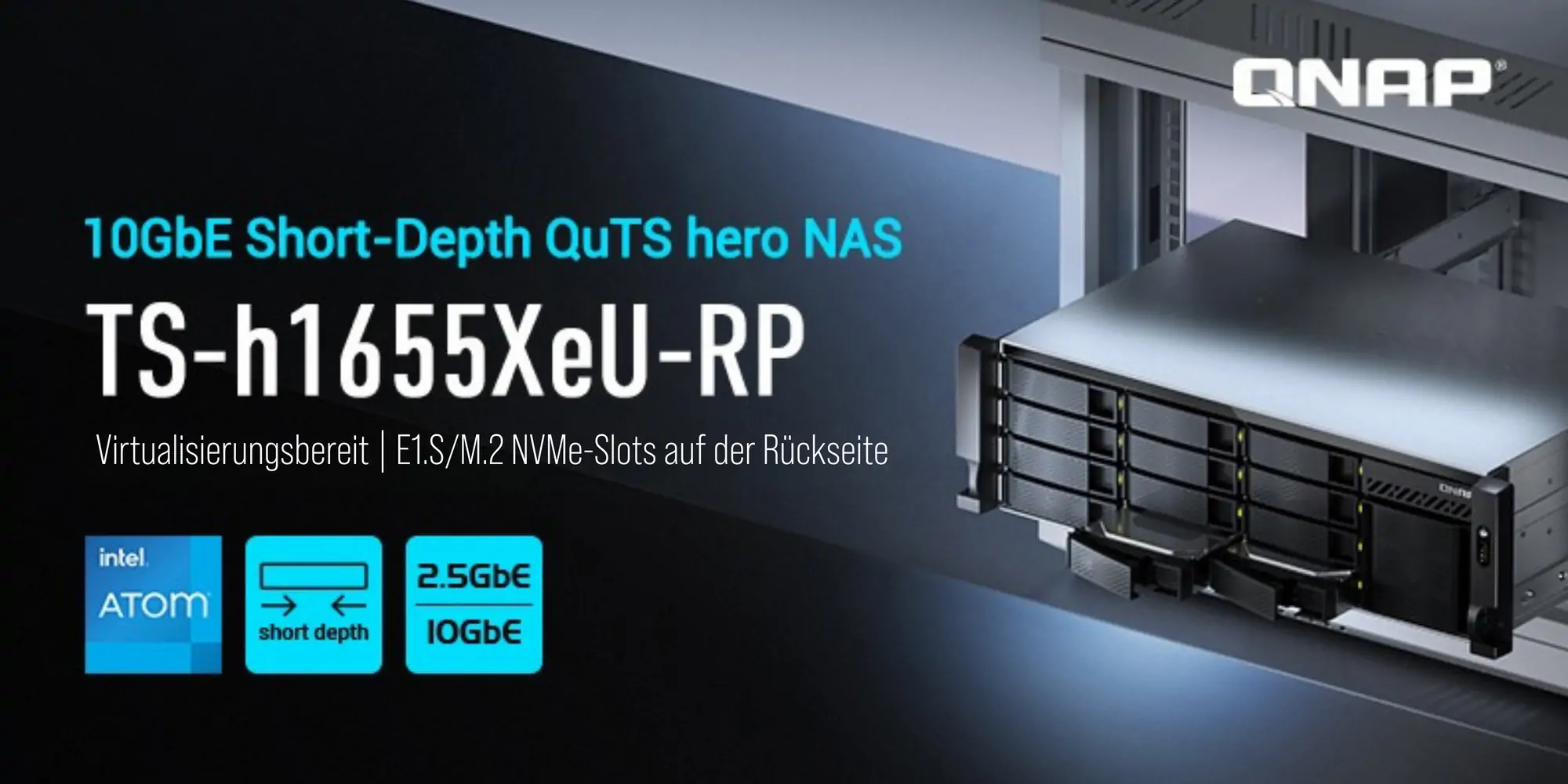 QNAP® Systems, Inc., ein führender Innovator von Computer-, Netzwerk- und Speicherlösungen, hat das TS-h1655XeU-RP vorgestellt, ein 10 GbE NAS mit kurzer Tiefe, das für Unternehmen und Profis mit begrenztem Rackplatz konzipiert wurde. Mit dem ZFS-basierten QuTS hero Betriebssystem bietet das TS-h1655XeU-RP zwölf 3,5-Zoll SATA-Laufwerksschächte und vier vielseitige E1.S/M.2 PCIe NVMe-Steckplätze. Diese leistungsstarke Speicherlösung mit hoher Kapazität bietet Zugänglichkeit, Skalierbarkeit und Datenintegrität – ideal für zentrale Speicherung und Backup, Zusammenarbeit, Virtualisierung und Videoüberwachungsanwendungen.