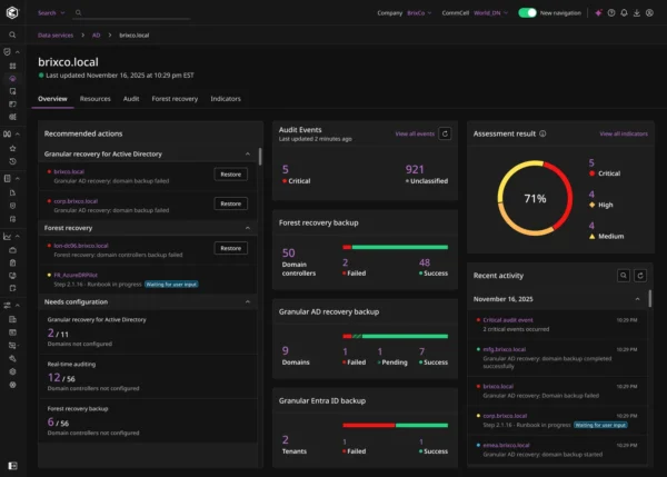 Commvault integriert seine Active Directory Forest Recovery ebenfalls in die Cleanroom Recovery. Dadurch können Kunden AD-Gesamtstrukturen nun in einem isolierten digitalen Reinraum wiederherstellen. Zudem können sie ihre Wiederherstellungspläne im Voraus testen, ohne die Identitätssysteme in der Produktion zu beeinträchtigen.
