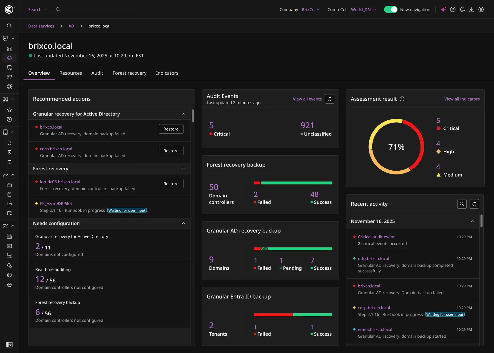- Übersicht des Sicherheitsstatus des Active Directory in der Commvault Cloud.
