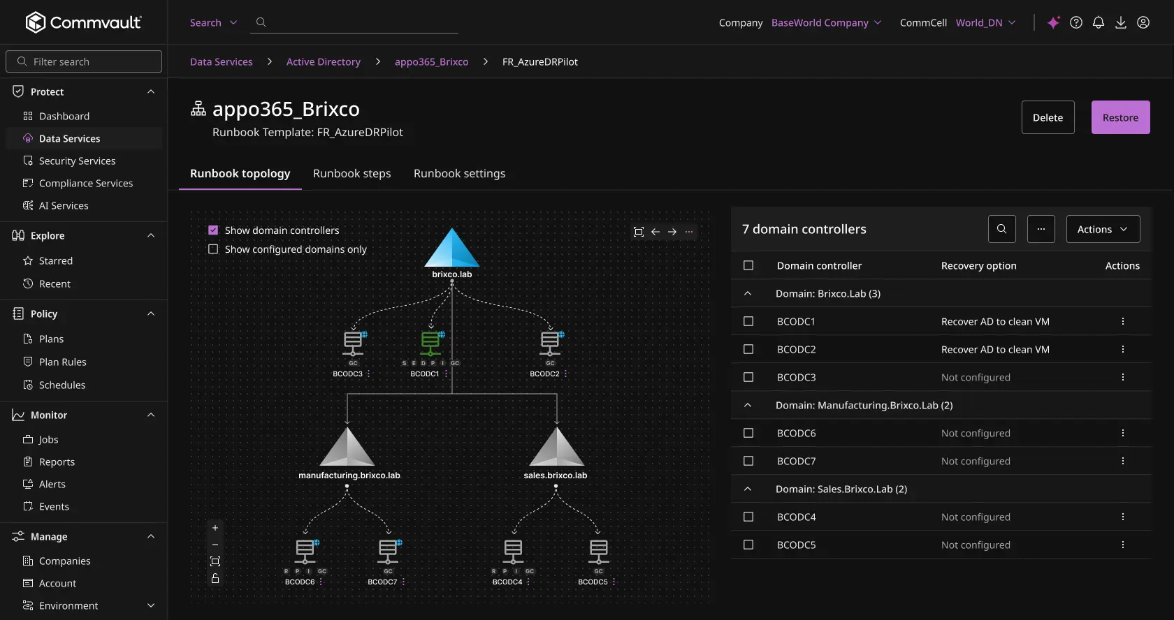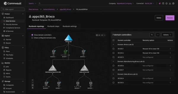 - Die Active Directory Forest Recovery als Teil der Commvault Cleanroom Recovery zeigt die Topologie des Active Directory Forest an und ermöglicht so die funktionsfähige Wiederherstellung des gesamten Active Directory Forest.