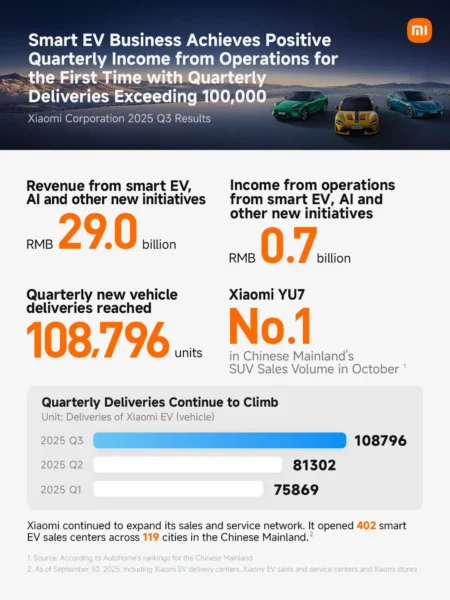 Im dritten Quartal stiegen die Auslieferungen von Xiaomis Smart-EVs weiter an: Die Auslieferungen in Q3 überschritten 100.000 Fahrzeuge und erreichten einen neuen Rekordwert von 108.796 Fahrzeugen. In den ersten drei Quartalen dieses Jahres überschritten die kumulierten Auslieferungen von Xiaomi Smart-EVs 260.000 Fahrzeuge. Zudem setzte Xiaomi die Expansion seines Vertriebs- und Servicenetzwerks fort. Bis zum 30. September 2025 unterhielt Xiaomi 402 Smart-EV-Verkaufszentren in 119 Städten auf Festlandchina.