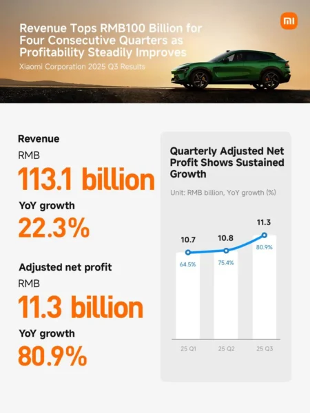 Die Xiaomi Corporation („Xiaomi“ oder die „Gruppe“; Börsenkürzel: 1810), ein weltweit führendes Unternehmen für Unterhaltungselektronik und intelligente Fertigung mit einem Kernangebot aus Smartphones und durch eine IoT-Plattform vernetzte Smart Devices, hat die ungeprüften konsolidierten Ergebnisse für die drei Monate bis zum 30. September 2025 („Q3 2025“ oder „der Zeitraum“) bekannt gegeben. Die Unternehmensleistung im dritten Quartal setzte ihre starke Wachstumsdynamik fort. Der Gesamtumsatz im dritten Quartal erreichte 113,1 Milliarden RMB, was einem Anstieg von 22,3 Prozent gegenüber dem Vorjahreszeitraum entspricht. Damit überschritt der Umsatz zum vierten Mal in Folge die Marke von 100 Milliarden RMB. Der bereinigte Nettogewinn stieg um 80,9 Prozent auf 11,3 Milliarden RMB, erreichte ein Rekordhoch und übertraf die Markterwartungen deutlich. Der Gesamtumsatz der ersten drei Quartale des Jahres belief sich auf 340,4 Milliarden RMB und näherte sich damit bereits dem Jahresumsatz des Vorjahres. Der bereinigte Nettogewinn lag mit 32,8 Milliarden RMB bereits über dem Gesamtniveau des Vorjahres.