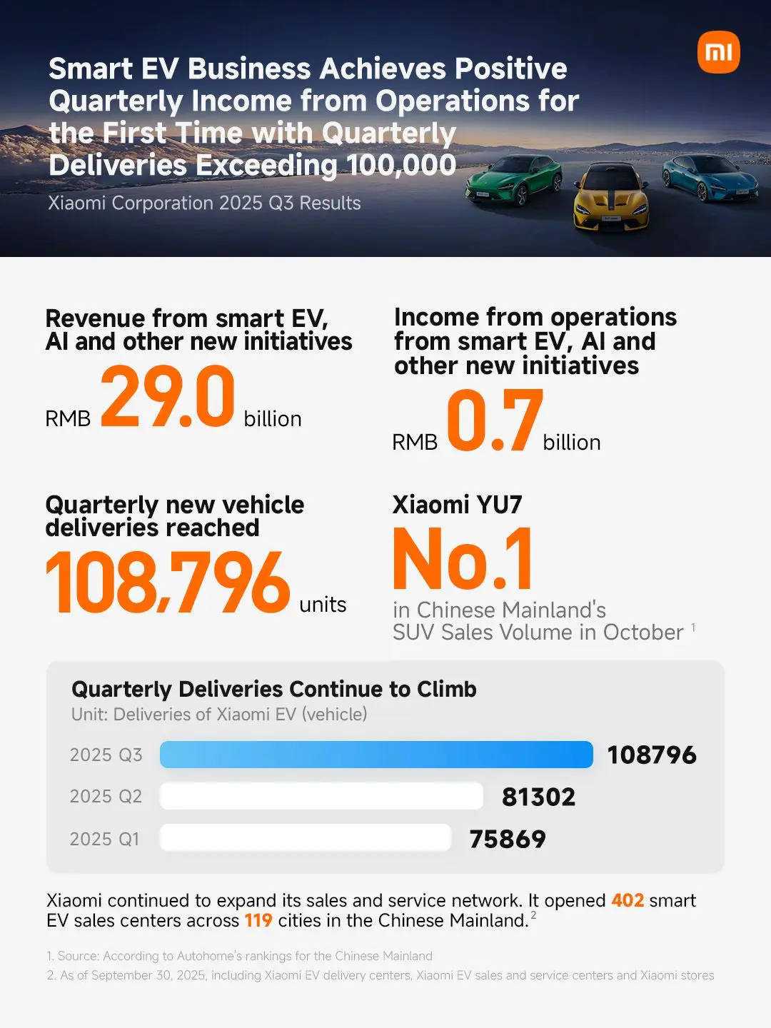Im dritten Quartal stiegen die Auslieferungen von Xiaomis Smart-EVs weiter an: Die Auslieferungen in Q3 überschritten 100.000 Fahrzeuge und erreichten einen neuen Rekordwert von 108.796 Fahrzeugen. In den ersten drei Quartalen dieses Jahres überschritten die kumulierten Auslieferungen von Xiaomi Smart-EVs 260.000 Fahrzeuge. Zudem setzte Xiaomi die Expansion seines Vertriebs- und Servicenetzwerks fort. Bis zum 30. September 2025 unterhielt Xiaomi 402 Smart-EV-Verkaufszentren in 119 Städten auf Festlandchina.