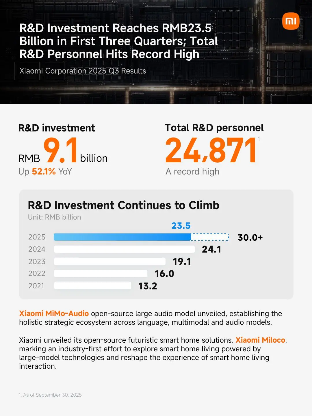 Xiaomi setzt seine signifikante Erhöhung der Investitionen in grundlegende Kerntechnologien fort. Die Ausgaben in Forschung und Entwicklung (F&E) erreichten im dritten Quartal 9,1 Milliarden RMB – ein neuer Höchstwert und ein Anstieg von 52,1 Prozent im Vergleich zum vorausgegangenen Jahr. Die Gesamtausgaben für F&E in den ersten drei Quartalen beliefen sich auf 23,5 Milliarden RMB. Die Gruppe erwartet, dass die Gesamtinvestitionen für F&E im Jahr 2025 die Marke von 30,0 Milliarden RMB übersteigen werden. Zum 30. September 2025 erreichte die Zahl der F&E-Mitarbeiter bei Xiaomi einen Rekordwert von 24.871.