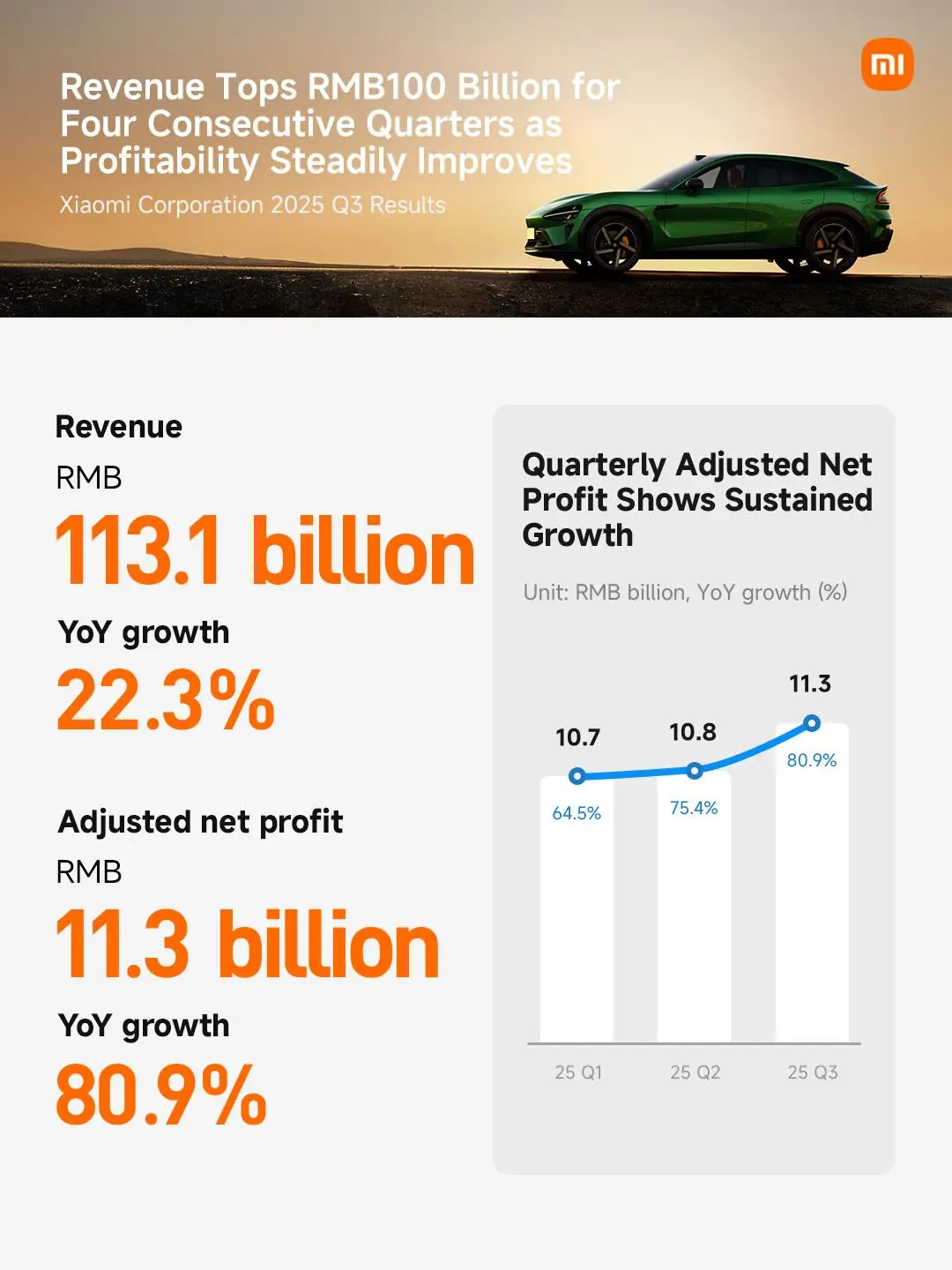 Das Segment für smarte Elektrofahrzeuge, KI und andere neue Initiativen von Xiaomi verzeichnete weiterhin ein rapides Wachstum und erzielte im dritten Quartal einen Umsatz von 29,0 Milliarden RMB. Erstmals meldete das Geschäft einen positiven Betriebsertrag von 0,7 Milliarden RMB, was auf den Eintritt in eine neue Phase gesunder und nachhaltiger Entwicklung hinweist.