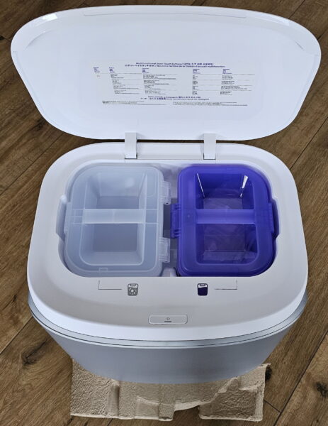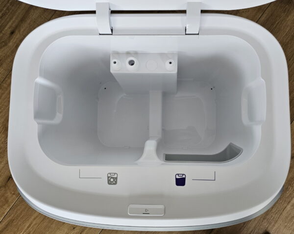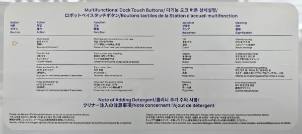 Die beiden Wasserbehälter fassen weiterhin rund fünf Liter Inhalt. Unter dem Deckel befindet sich eine Anleitung für die Tasten der Station, leider aber nicht auf Deutsch. Das mitgelieferte Reinigungsmittel wird jetzt direkt in den Frischwasserbehälter gegeben und nicht mehr automatisch von der Station dosiert. Letzteres ist aber noch als Platzhalter vorgehalten.