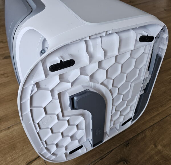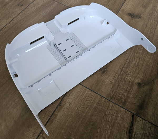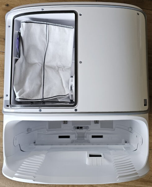 Die Garage für den eigentlichen Roboter sieht ähnlich wie bei den Vorgängern aus. Da keine rotierenden Mops von der Station ausgewaschen werden, sondern dies quasi schon während dem Wischen geschieht, sieht der Reinigungseinsatz deutlich anders aus. Auf der Unterseite der Station sind außerdem die Absaugrohre zu erkennen.