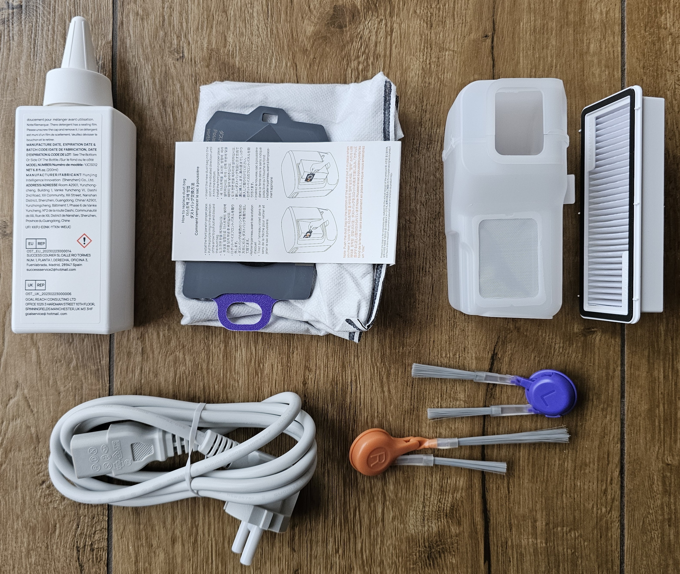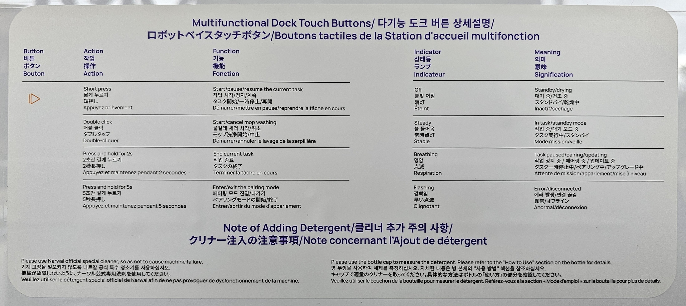 Die beiden Wasserbehälter fassen weiterhin rund fünf Liter Inhalt. Unter dem Deckel befindet sich eine Anleitung für die Tasten der Station, leider aber nicht auf Deutsch. Das mitgelieferte Reinigungsmittel wird jetzt direkt in den Frischwasserbehälter gegeben und nicht mehr automatisch von der Station dosiert. Letzteres ist aber noch als Platzhalter vorgehalten.
