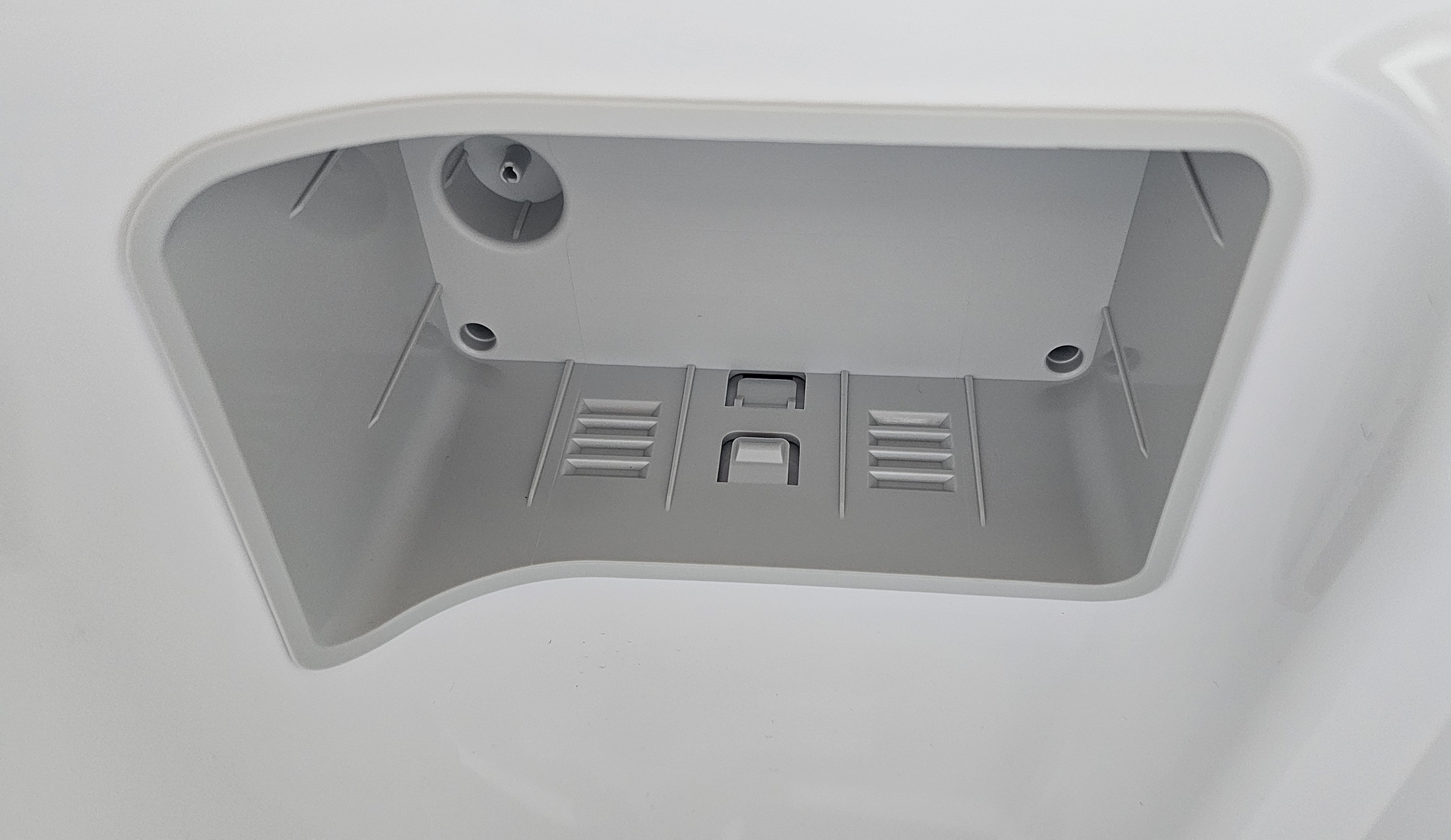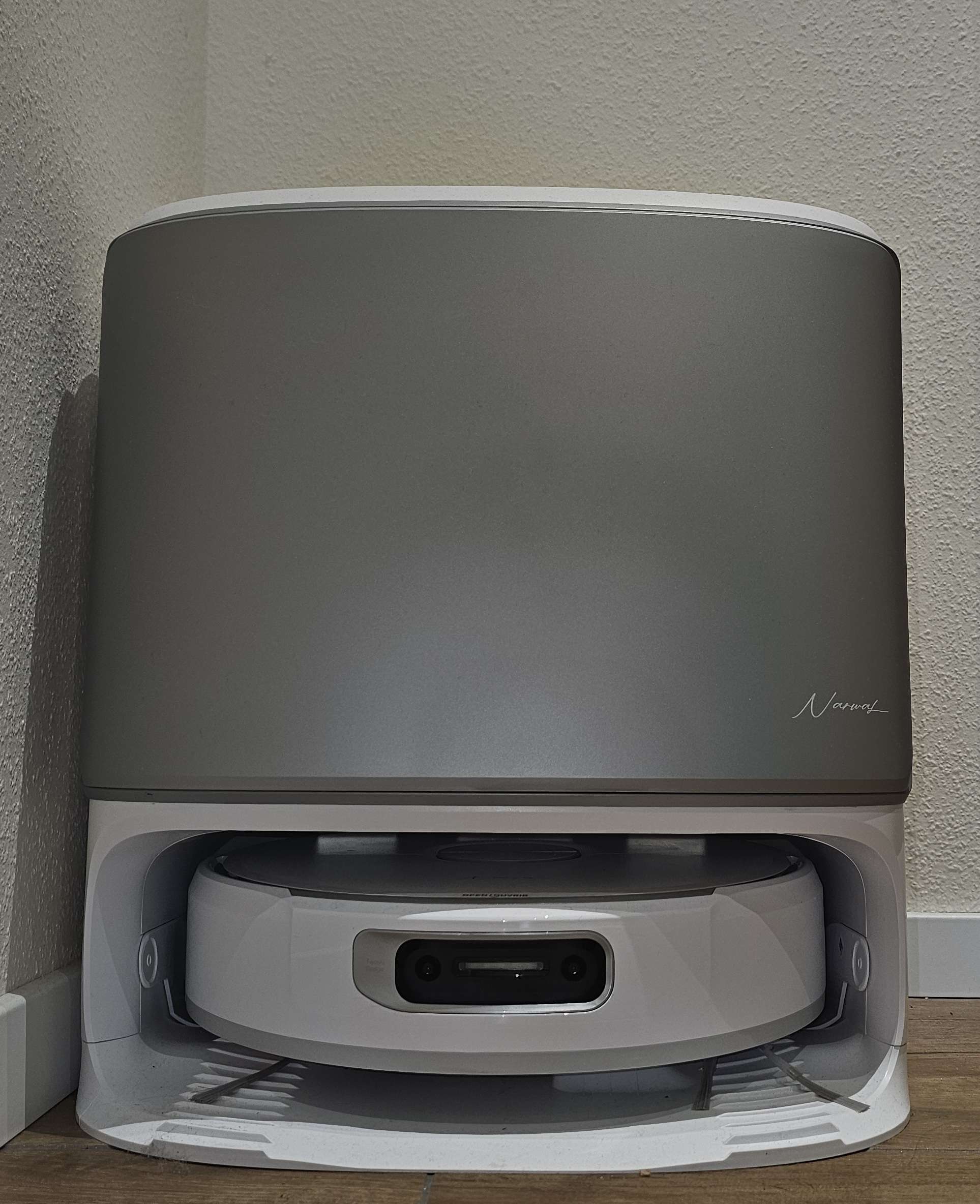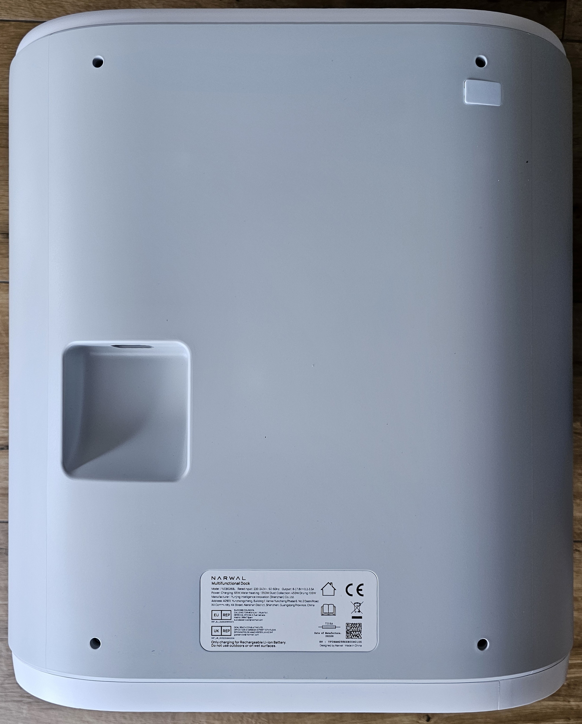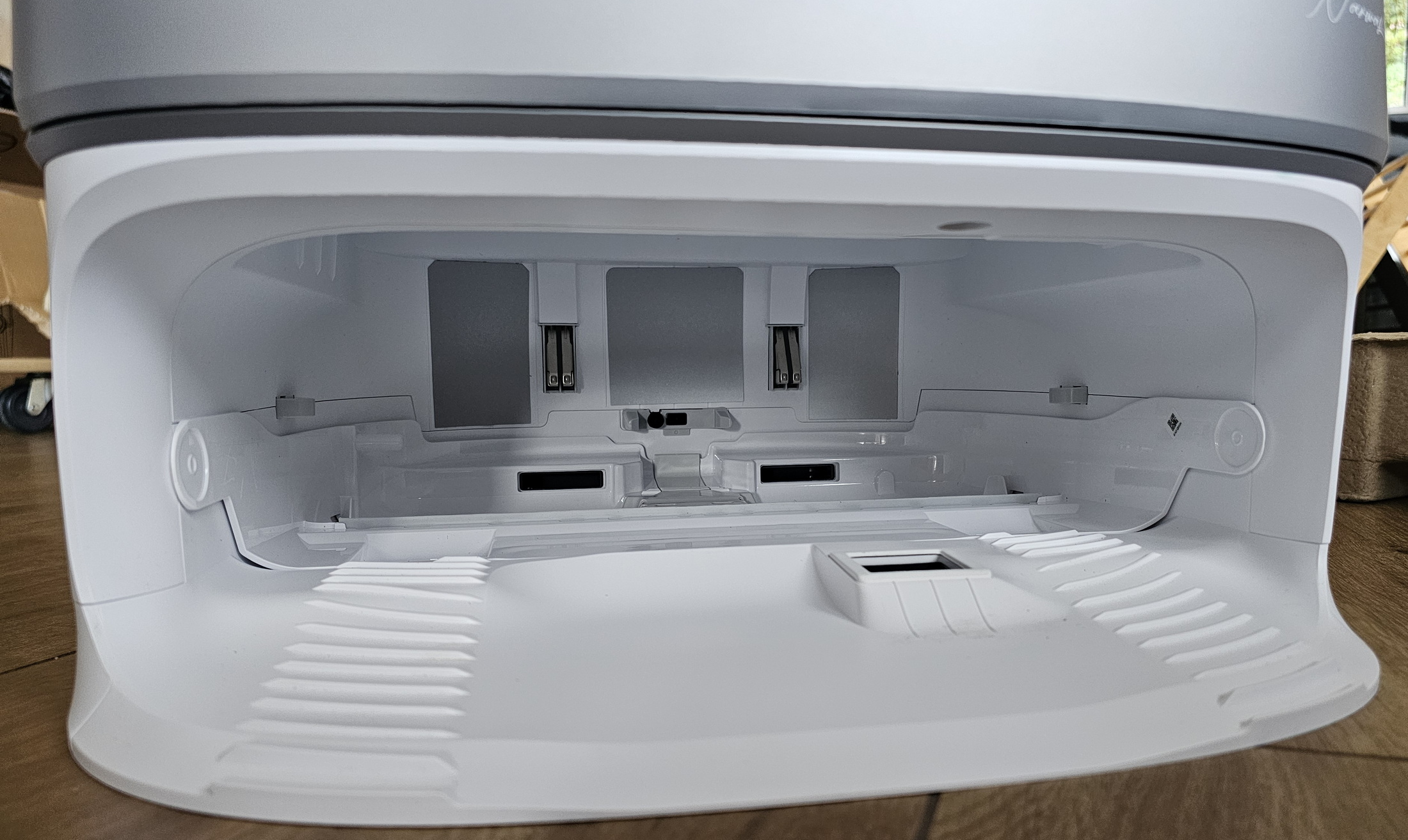 Die Garage für den eigentlichen Roboter sieht ähnlich wie bei den Vorgängern aus. Da keine rotierenden Mops von der Station ausgewaschen werden, sondern dies quasi schon während dem Wischen geschieht, sieht der Reinigungseinsatz deutlich anders aus. Auf der Unterseite der Station sind außerdem die Absaugrohre zu erkennen.