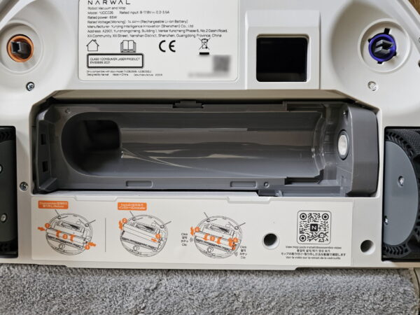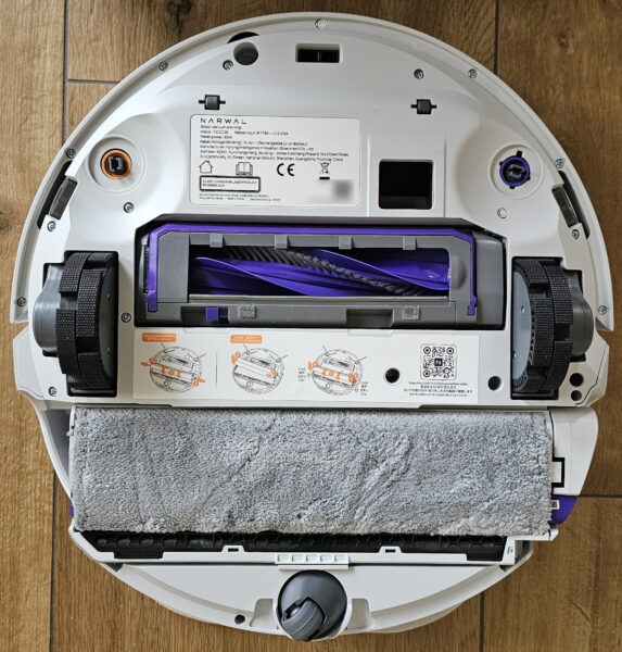 Ebenfalls sehr spannend ist die Unterseite. Die Seitenbürsten sind bei Lieferung noch nicht montiert. Zwischen diesen ist die Öffnung für die Staubabsaugung zu sehen. Die Bodenwalze und ihr Saugkanal sind so aufgebaut, dass die Haare zur auf dem Bild linken Seite transportiert und dort abgesaugt werden.