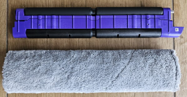 Die Wischwalze kann ebenfalls herausgenommen und zerlegt werden. Sie besteht aus einem mechanischen Modul, das den Wischbezug spannt und so in seine flache Form mit viel Bodenkontakt zwingt. Dieses ganze Wischmodul kann der Sauger rechts heraus schieben und so randnah wischen.