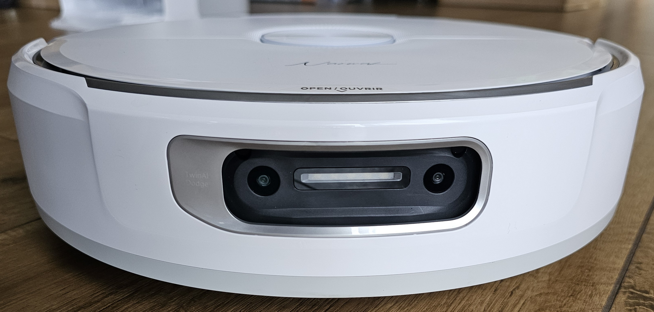 Doch der LiDAR Sensor wurde nicht einfach gespart, sondern ist in das Hinterteil des Roboters gewandert. Die schwarze Einbuchtung ist nicht nur optisch attraktiv, sondern dient der Orientierung des Roboters. Darunter befinden sich die Ladekontakte und Wasseranschlüsse. An der Front befindet sich die Stereo-Kamera mit Beleuchtung zur Hindernisvermeidung, auf der rechten Seite gibt es einen weiteren Abstandssensor.