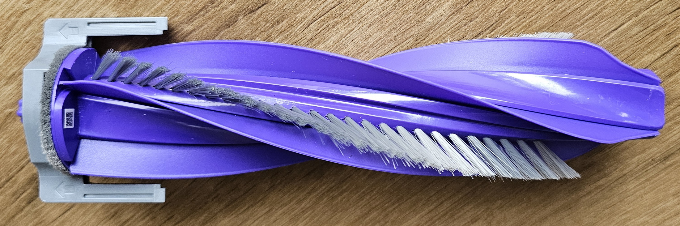 Ebenfalls sehr spannend ist die Unterseite. Die Seitenbürsten sind bei Lieferung noch nicht montiert. Zwischen diesen ist die Öffnung für die Staubabsaugung zu sehen. Die Bodenwalze und ihr Saugkanal sind so aufgebaut, dass die Haare zur auf dem Bild linken Seite transportiert und dort abgesaugt werden.