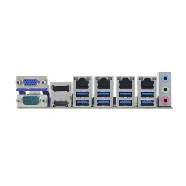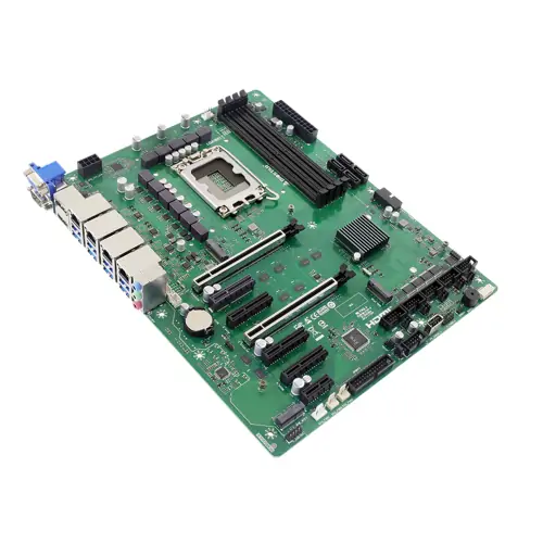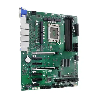Built-in I/O provides broad compatibility for industrial devices, offering 3 USB 2.0 ports, 8 USB 3.2 Gen2 ports, 2 USB 3.2 Gen1 ports, 4 RS232 ports, and 2 RS232/422/485 ports. The board also incorporates four PCIe 4.0 x4 slots and one PCIe 4.0 x1 slot, giving system integrators the flexibility to add communication interfaces, high-speed I/O cards, frame grabbers, and other specialized modules.