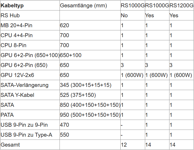 Einige Modelle beinhalten den RS HUB – ein abnehmbares, magnetisches USB-Modul mit vier USB-2.0-Headern (für bis zu acht Geräte). Er kann direkt am Netzteil befestigt und versorgt oder flexibel an einer beliebigen Stelle im Gehäuse magnetisch angebracht und über SATA betrieben werden. (Beim 1200-W-Modell enthalten, beim 1000-W-Modell optional.)