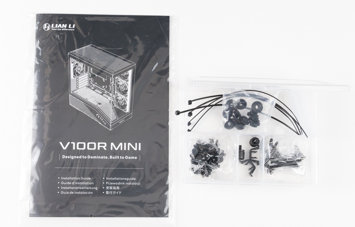 Der Lieferumfang besteht aus einer Anleitung, einigen Einwegkabelbindern, Gummierungen und Schrauben in einer Sortierbox für den Einbau der Hardware. Die beim großen Bruder mitgelieferte Grafikkartenhalterung ist in abgewandelter Form bereits im Gehäuse vorinstalliert.